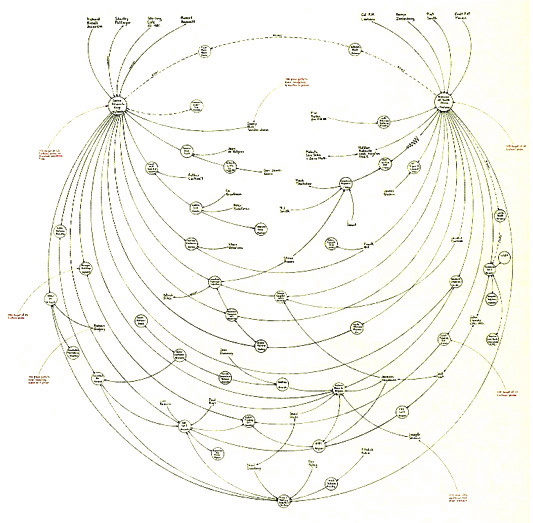 Mark Lombardi was a transformational hypertext artist – well at least – he is to me. But maybe even he didn’t know this because he never used the machinery of hypertext but looking at this art, to me, we can see that it really is hypertext. But the great transformational aspects of the work is the movement of his global networks of conspiratorial relationships from what could have turned into a dry preaching report to an art form immediately accessible and viable to all. Lombardi is quoted as saying: