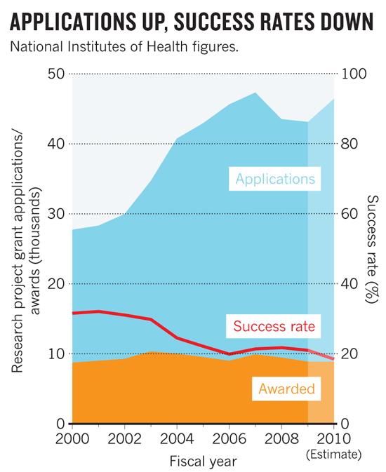 At the National Institutes of Health (NIH) in Bethesda, Maryland, which funds the majority of biomedical research in the United States, several years of flat federal funding combined with a rise in the number of applications means that 21% of research-project grant applications were funded in 2009, down from 32% ten years earlier (see graph). The situation in many other countries is just as tough.