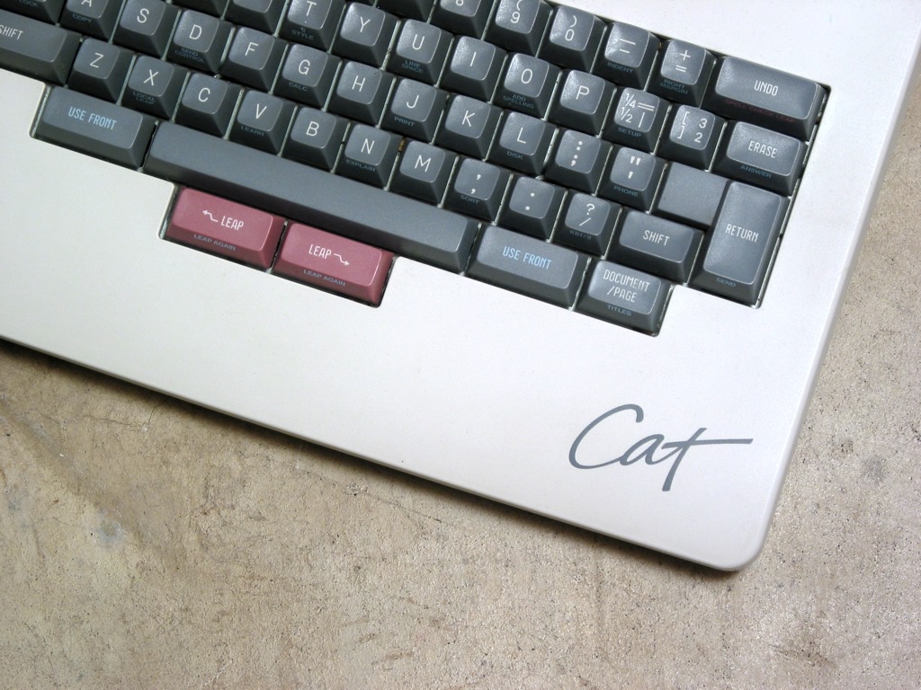 You moved through your data using two extra keys called Leap keys located in front of the spacebar key and by typing strings of characters. The Cat jumped to the next occurrence of that string. Raskin claimed that the Cat’s Leap-key search method to scroll from the top to the bottom of the page took 2 seconds, a mouse took 4 seconds, and cursor took 8 seconds. Larger documents increased these search ratios.